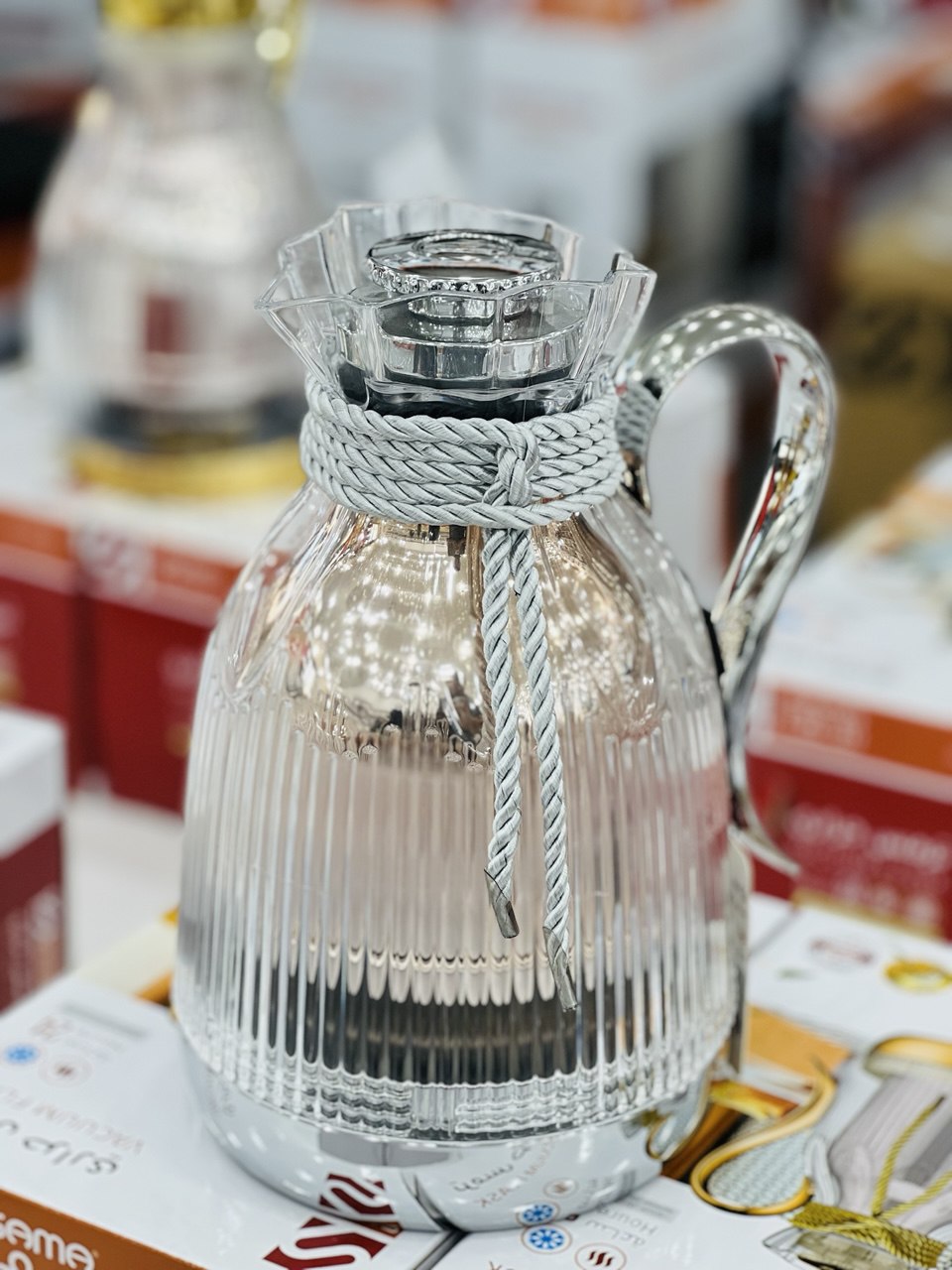 ترمس بتصميم فاخر يجمع بين الزجاج الشفاف والخطوط العمودية الراقية، مثالي لتقديم القهوة أو الشاي بأناقة