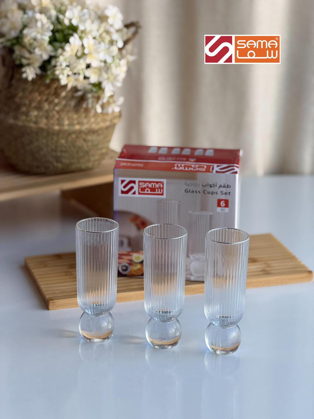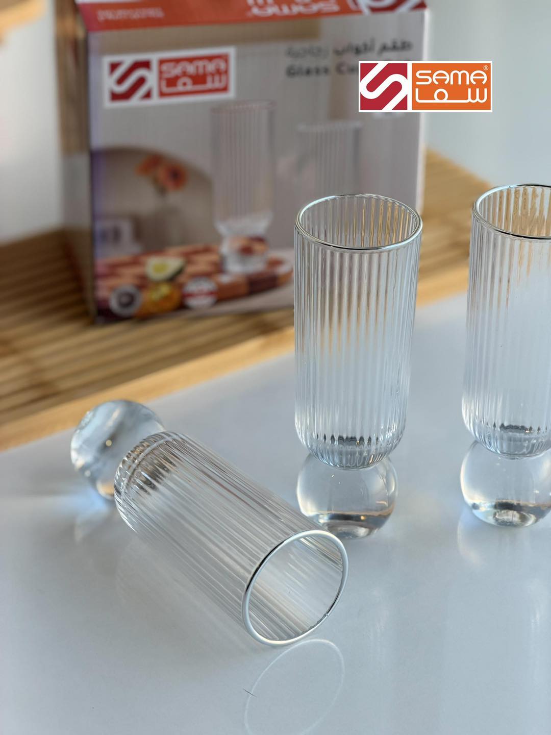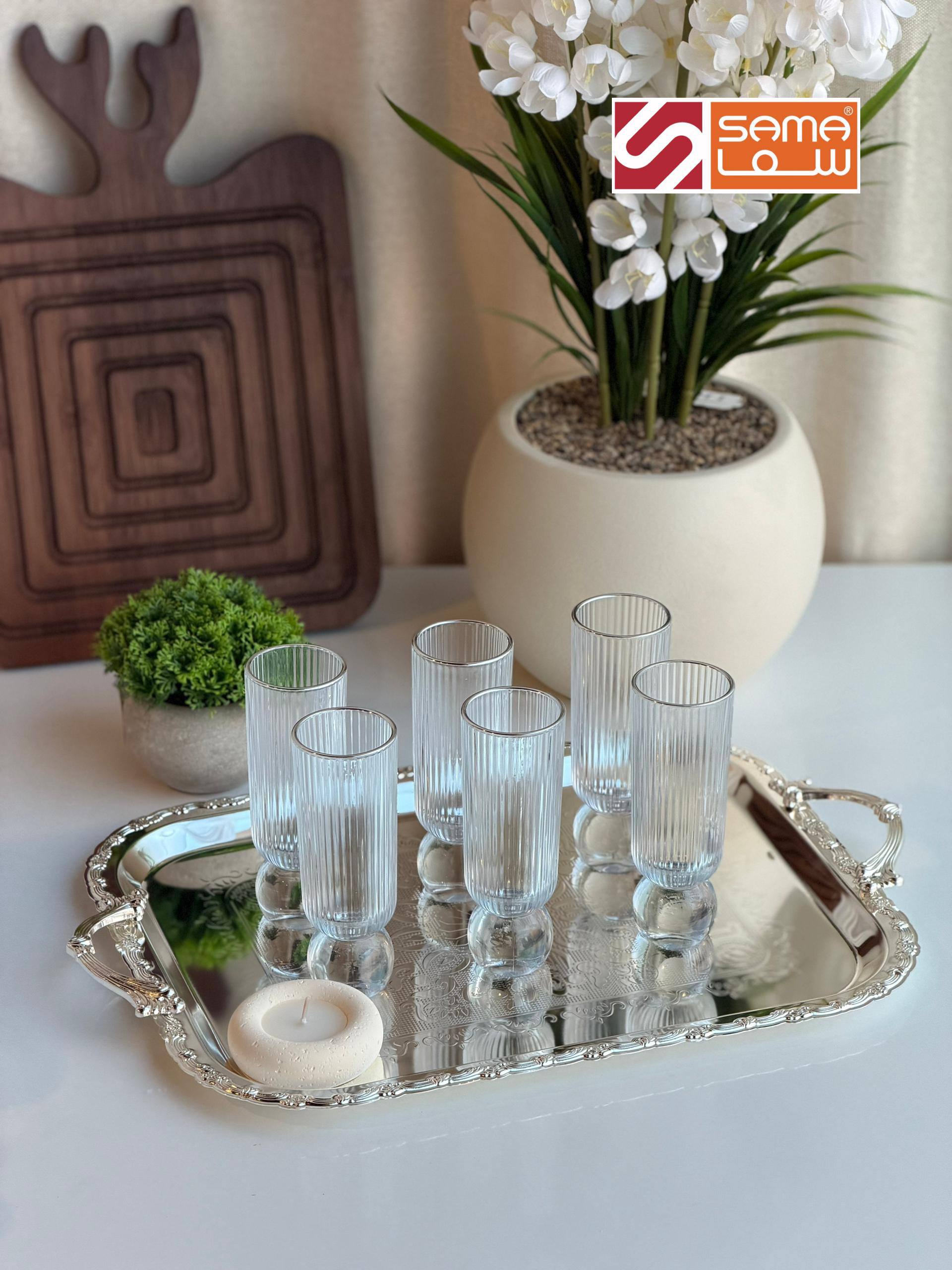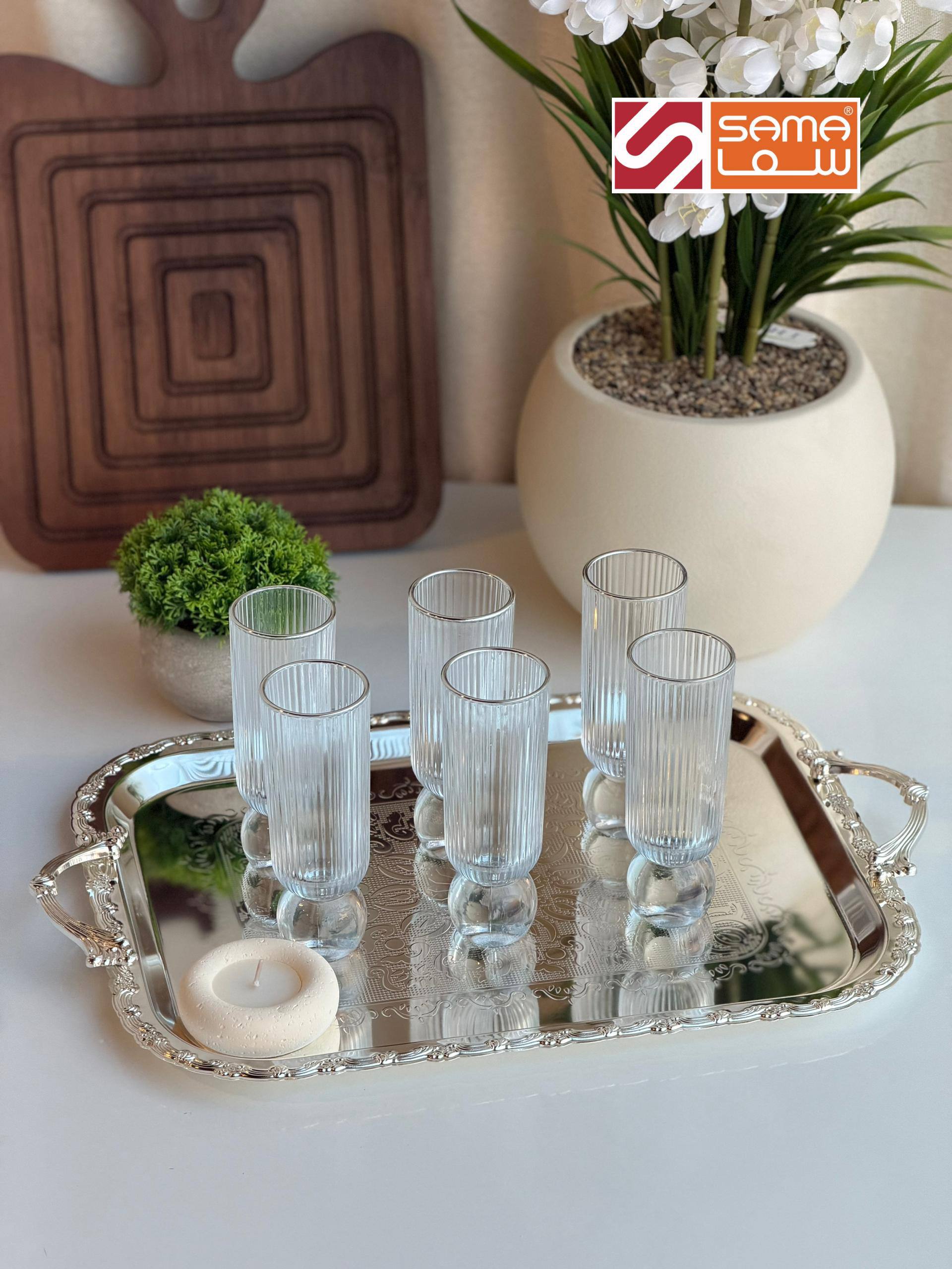 طقم كاسات راقي من 6 قطع بتصميم مخطط طولي أنيق، وحافة ذهبية وفضية ناعمة تزيد من جمال الشكل وتمنح لمسة فخامة. الكاسات مصنوعة من زجاج عالي الجودة، شفافة مع قاعدة ثابتة تضيف شكلًا عصريًا وجذابًا للمائدة.