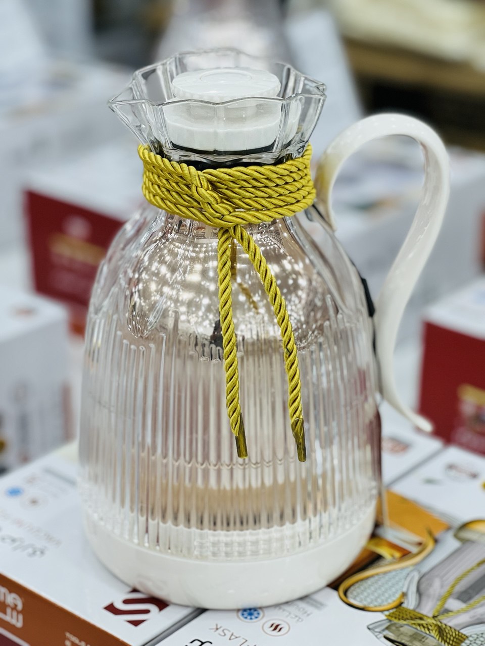 ترمس بتصميم فاخر يجمع بين الزجاج الشفاف والخطوط العمودية الراقية، مثالي لتقديم القهوة أو الشاي بأناقة